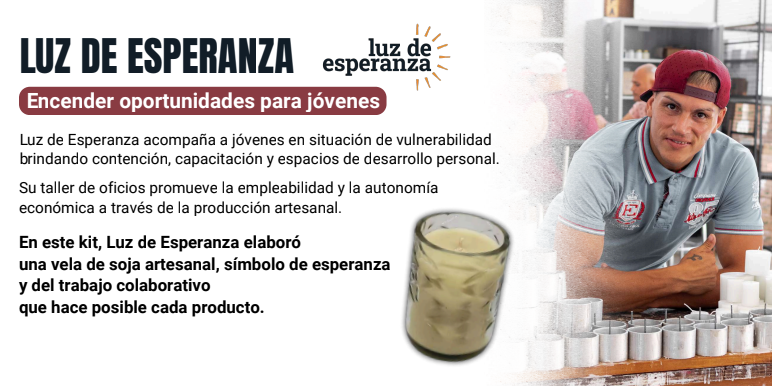 Por su parte, la ONG Luz de Esperanza aporta al kit una vela de soja artesanal, elaborada por jóvenes que participan en programas de formación y empleabilidad.