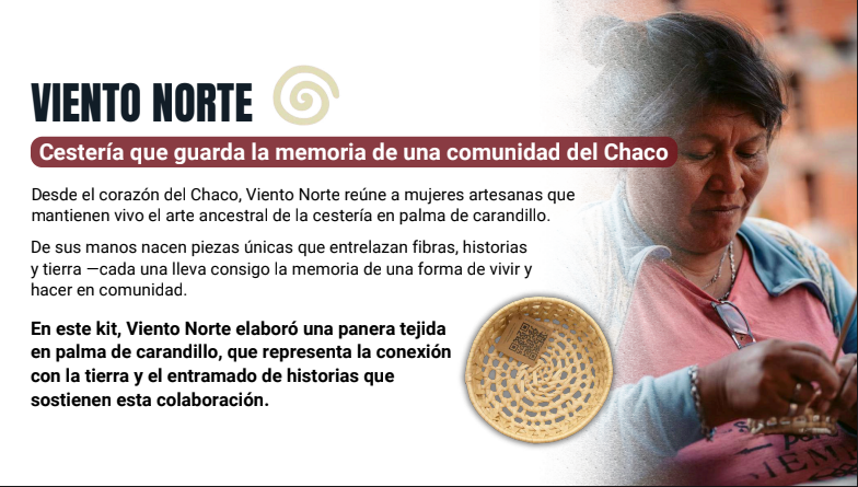Desde el Chaco, el proyecto Viento Norte, liderado por Michelle Courreges, integra el kit con una panera tejida en palma de carandillo. El emprendimiento reúne a mujeres artesanas que preservan técnicas ancestrales de cestería y trabajan con fibras naturales bajo prácticas que respetan el entorno.